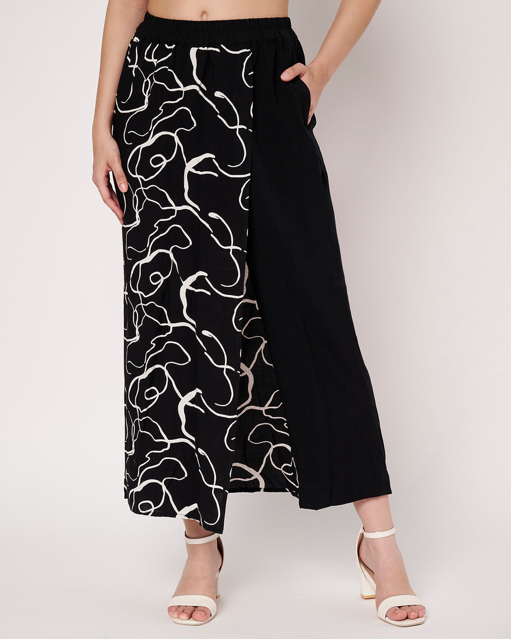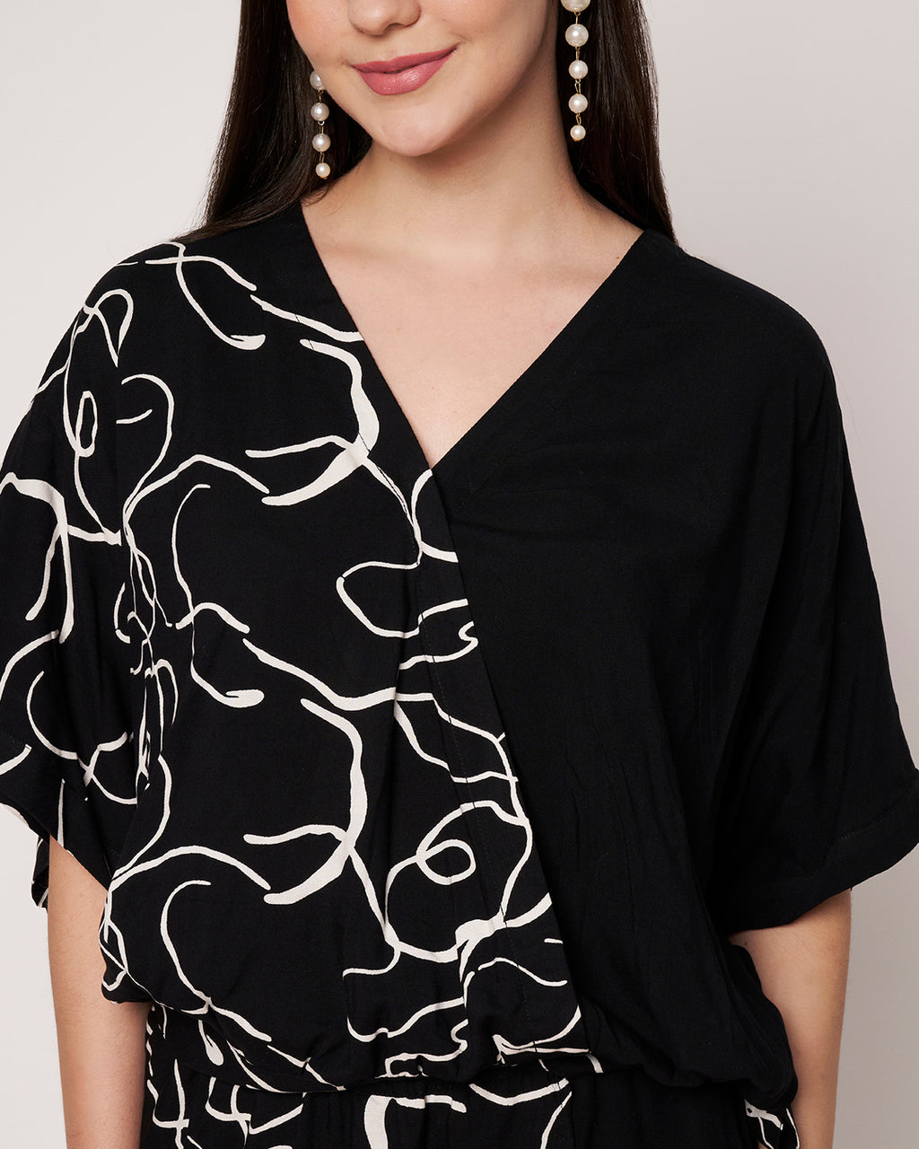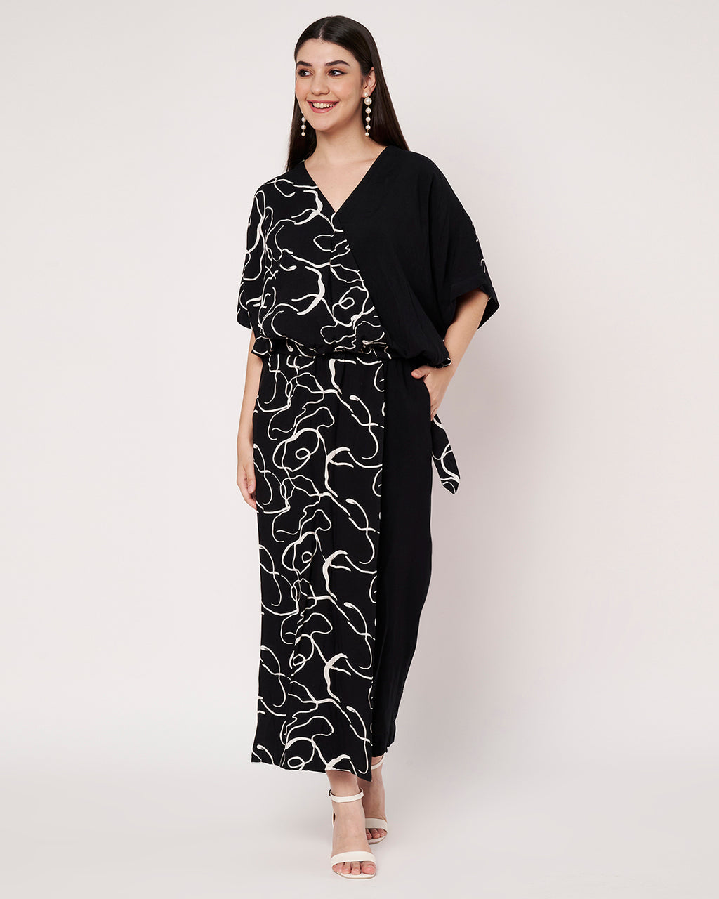 A modern kaftan dress in monochrome tones featuring bold abstract prints. The relaxed silhouette and drawstring waist make it perfect for easy movement and comfort.