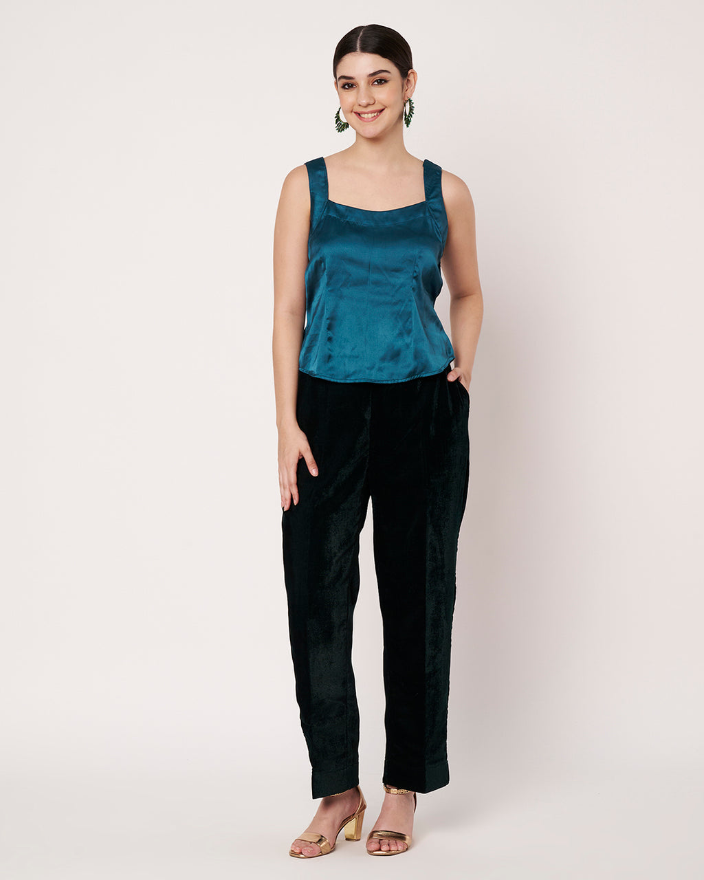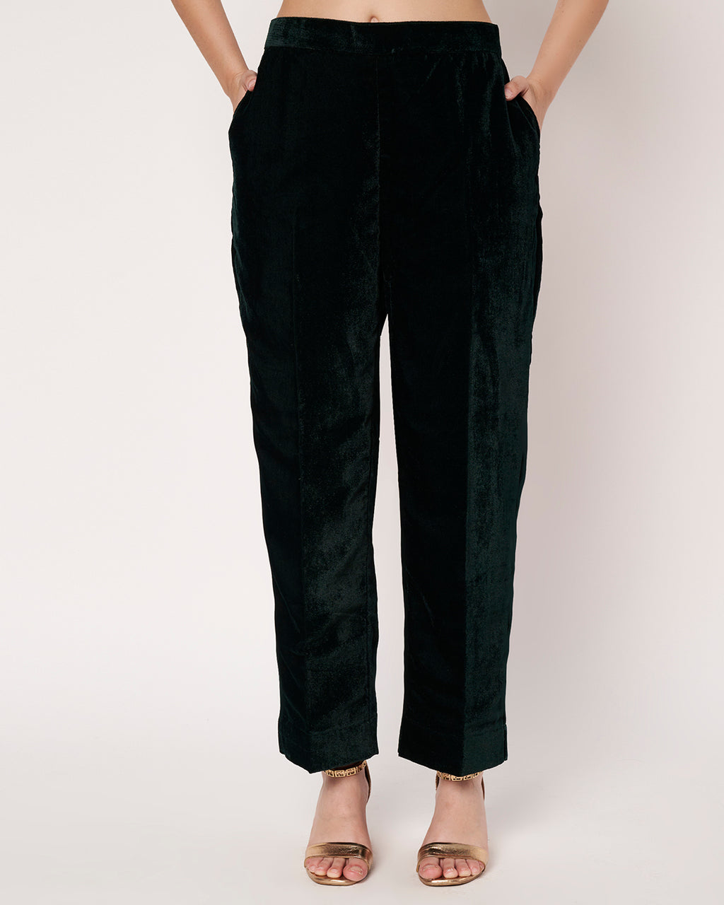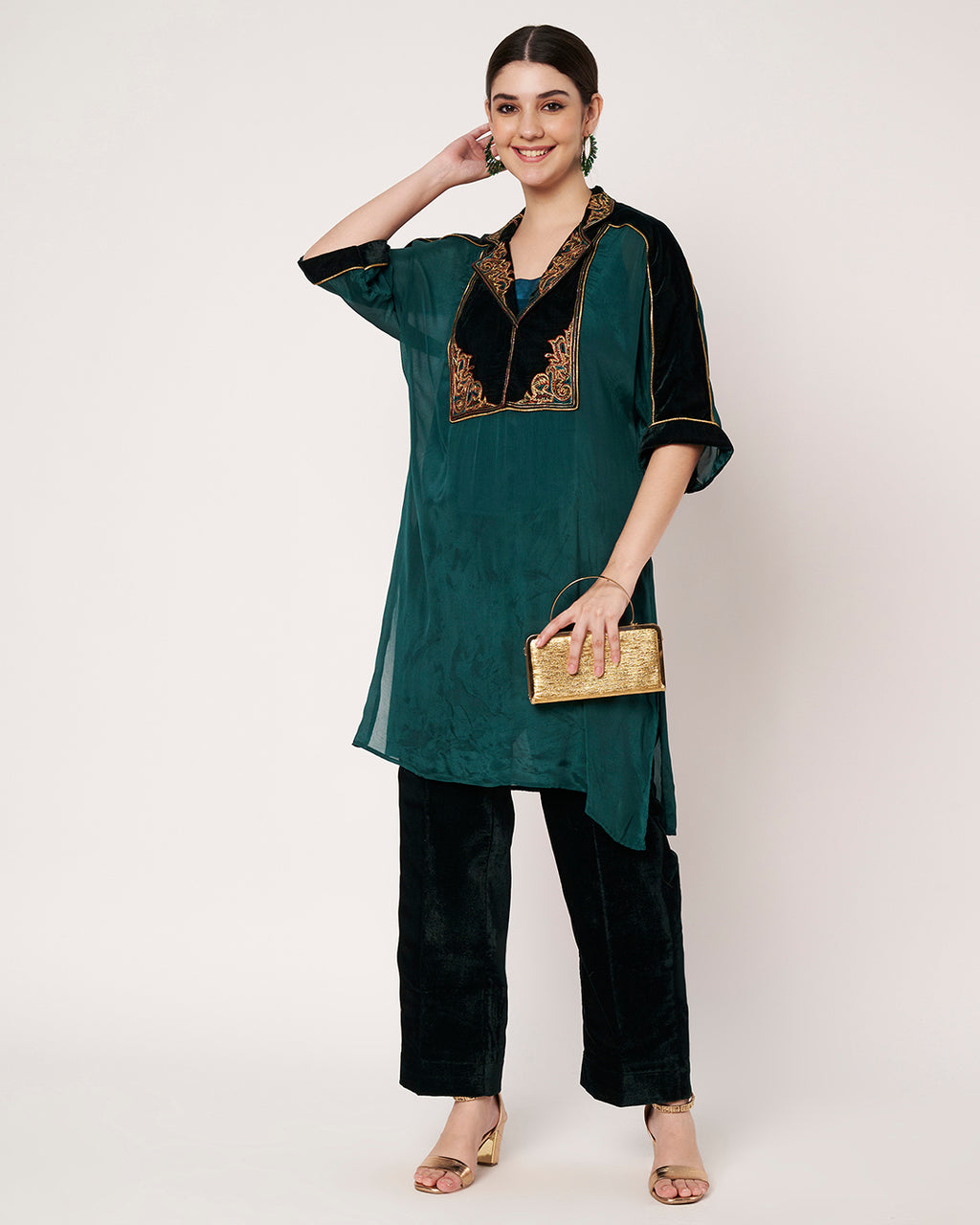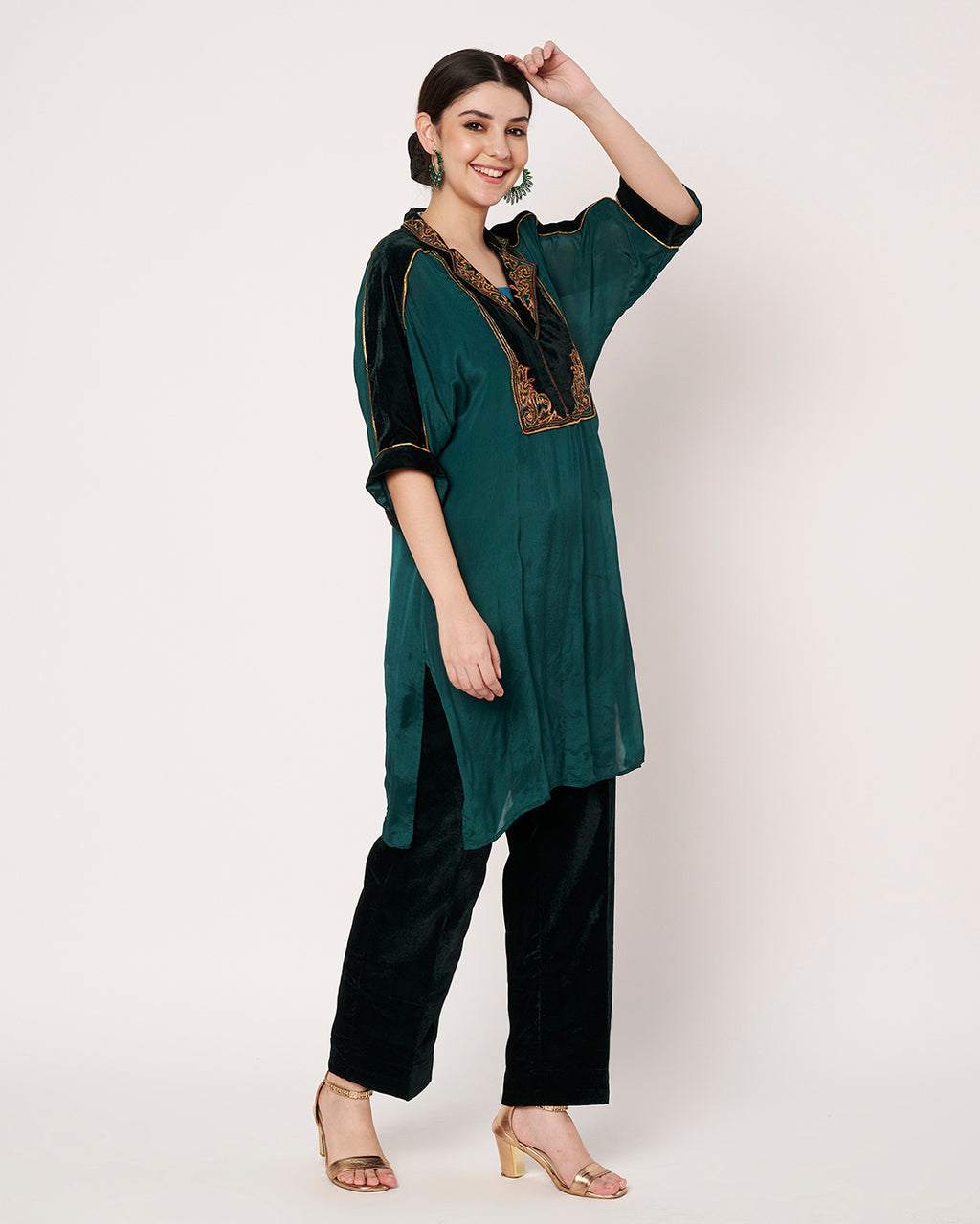 Crafted in soft blended fabric, this elegant green kurta set showcases a black embroidered yoke with subtle sequin detailing. Paired with matching straight pants for a polished silhouette.