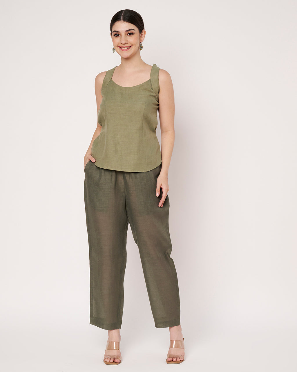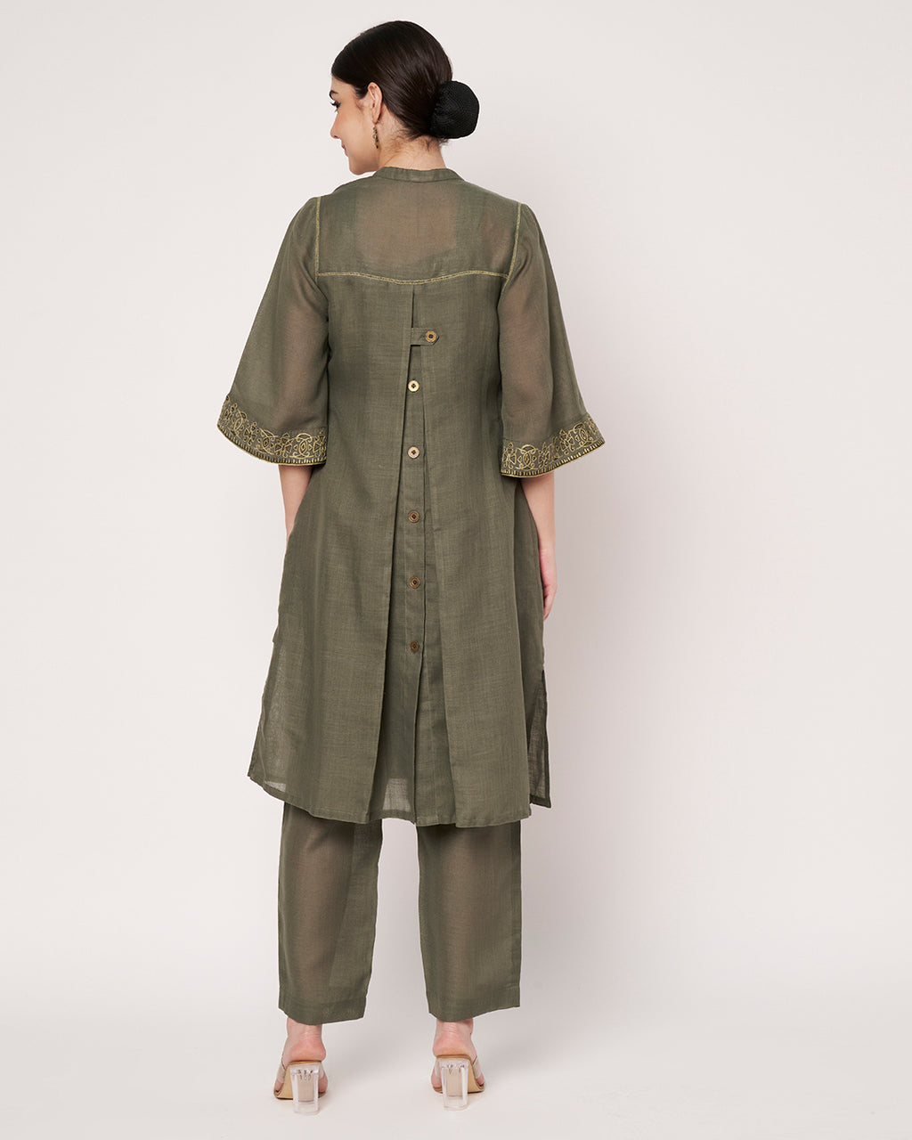 This open-front embroidered jacket set in golden olive tones exudes effortless luxury. The long jacket paired with straight pants creates a balanced fusion of traditional and contemporary style.