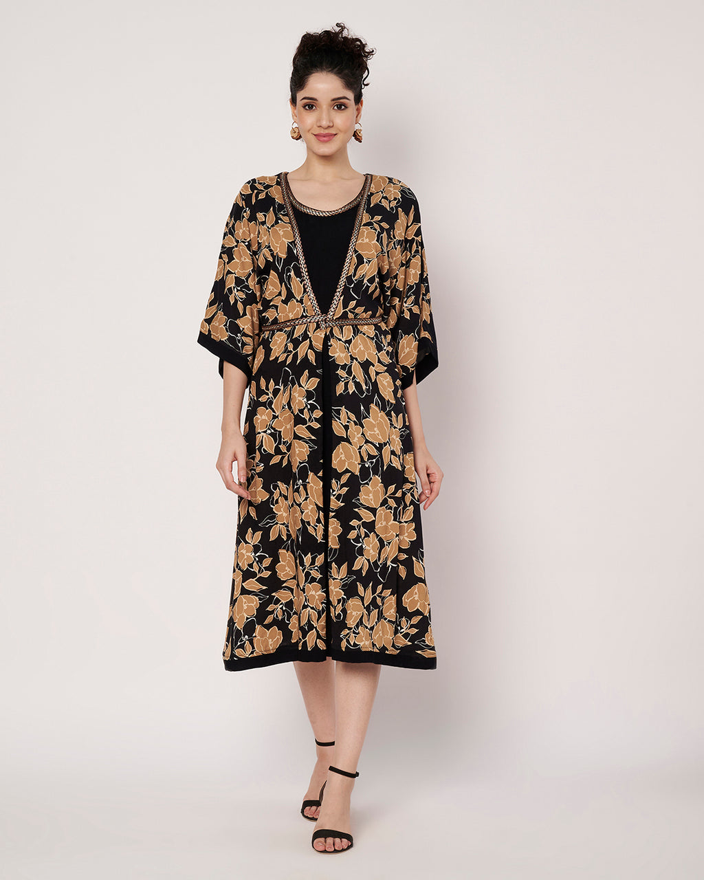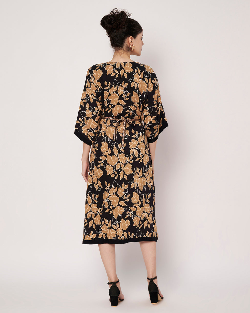 An elegant black and gold floral printed dress designed with a relaxed silhouette and a waist tie back. Lightweight yet luxurious, it’s your go-to outfit for comfort and style.