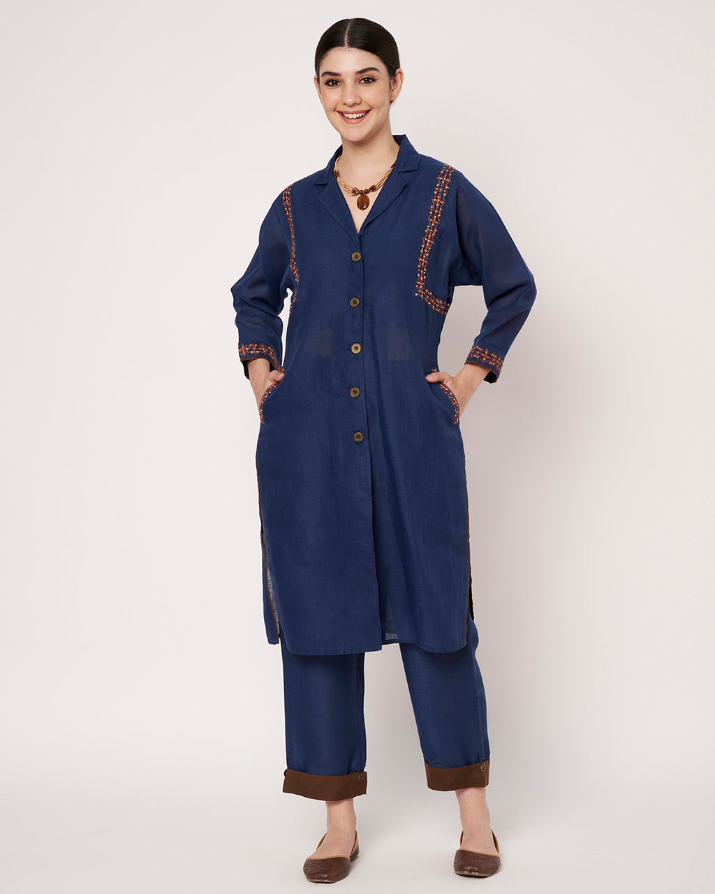 A classic indigo long kurta detailed with front buttons and subtle thread embroidery, styled with matching straight pants. Made from lightweight, flowy fabric for all-day comfort.