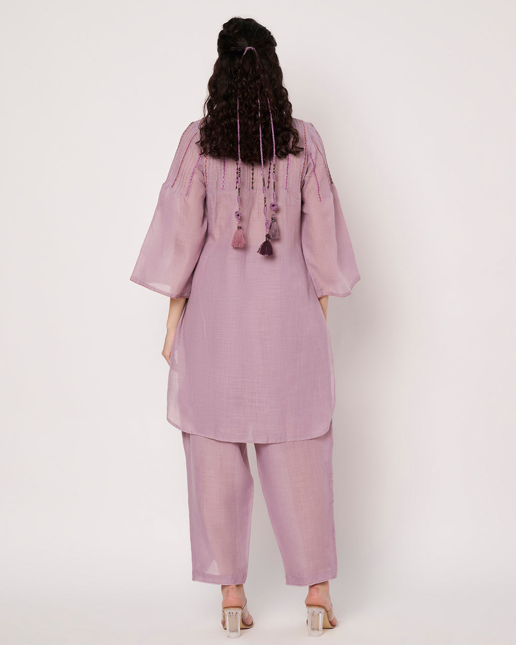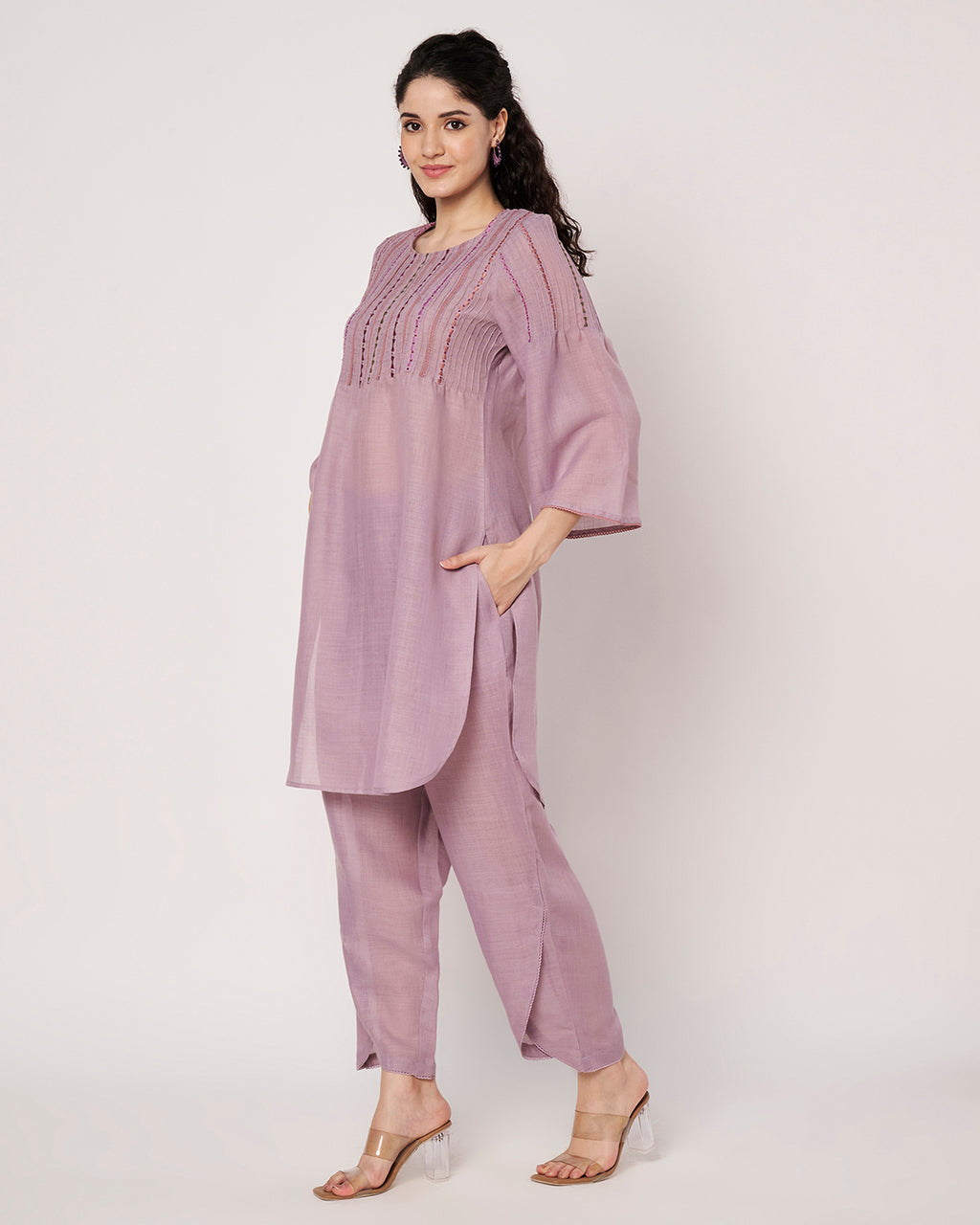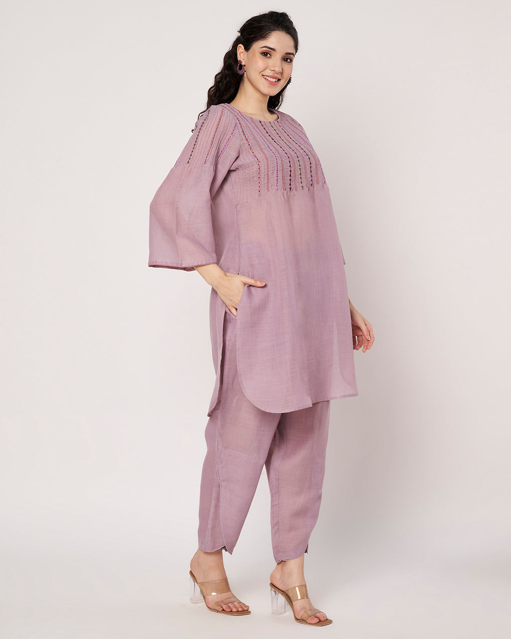 A soothing soft lavender kurta set featuring subtle embroidery detailing on the neckline and sleeves. The pastel tone exudes elegance and serenity, making it a perfect summer essential. Lightweight and breezy, it ensures both comfort and sophistication.