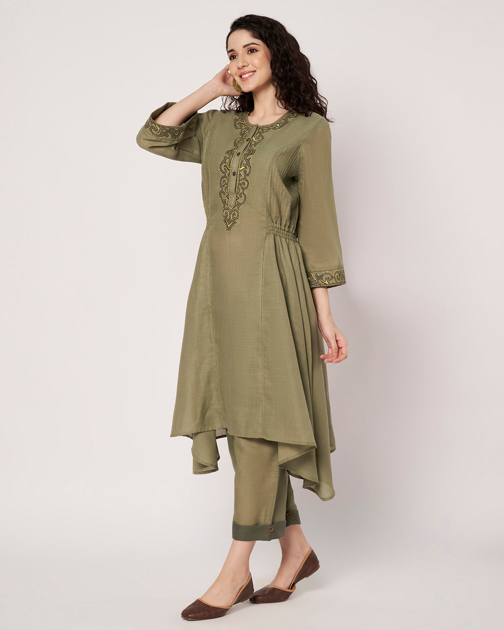 A statement of relaxed luxury, this olive-green kurta set features a flowy asymmetric hemline that flatters all body types. Designed for ease and elegance, it strikes the perfect balance between modern design and traditional subtlety.