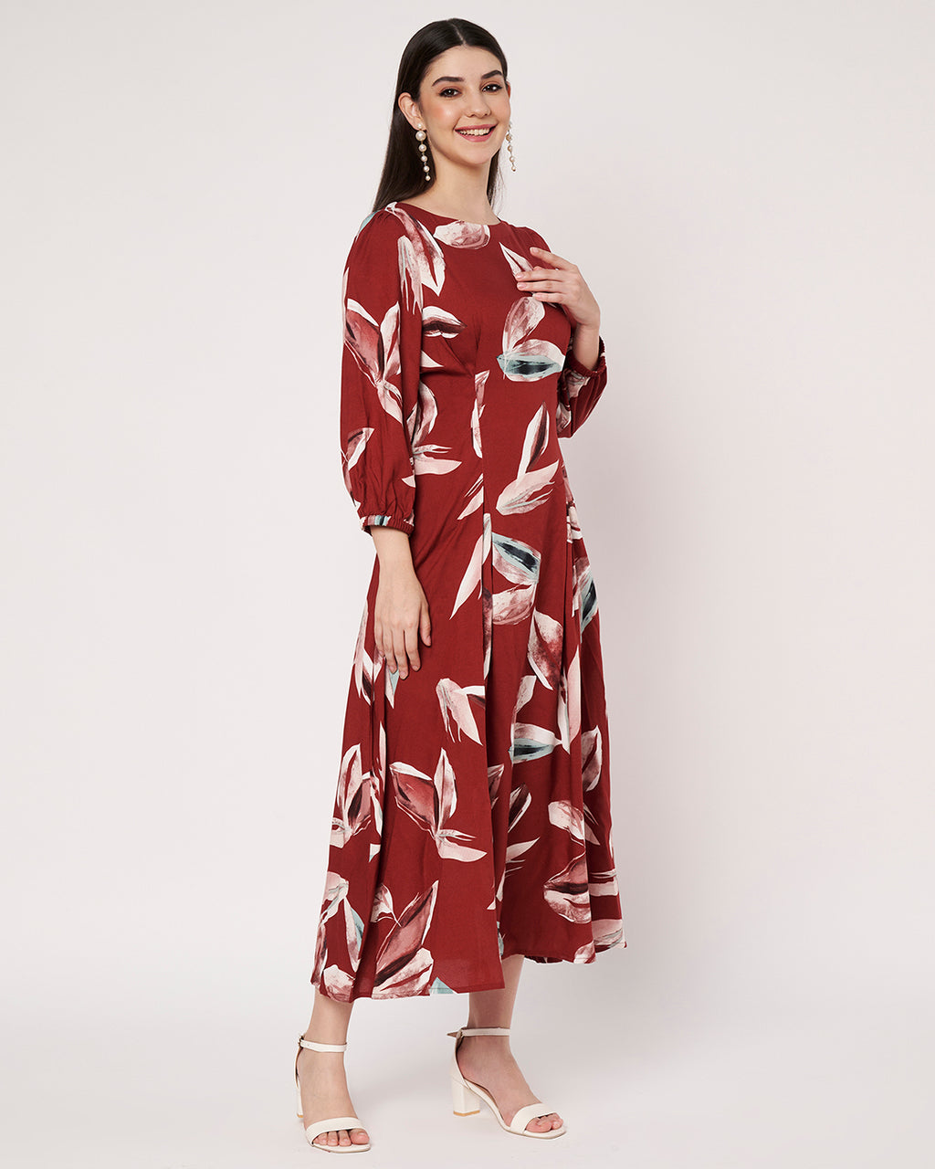 This ankle-length maroon maxi dress comes with all-over floral prints and flared sleeves for an elegant feminine vibe. The soft fabric ensures all-day comfort.