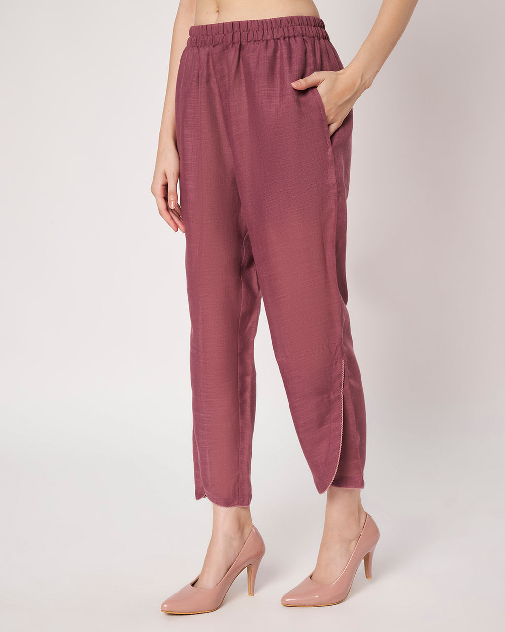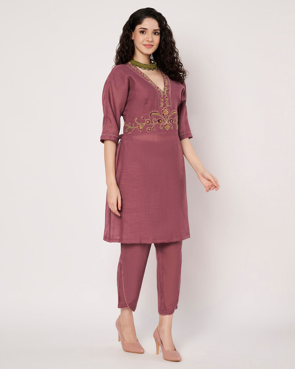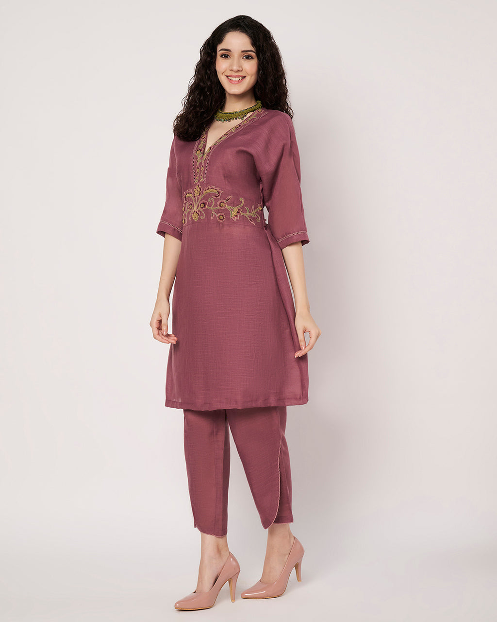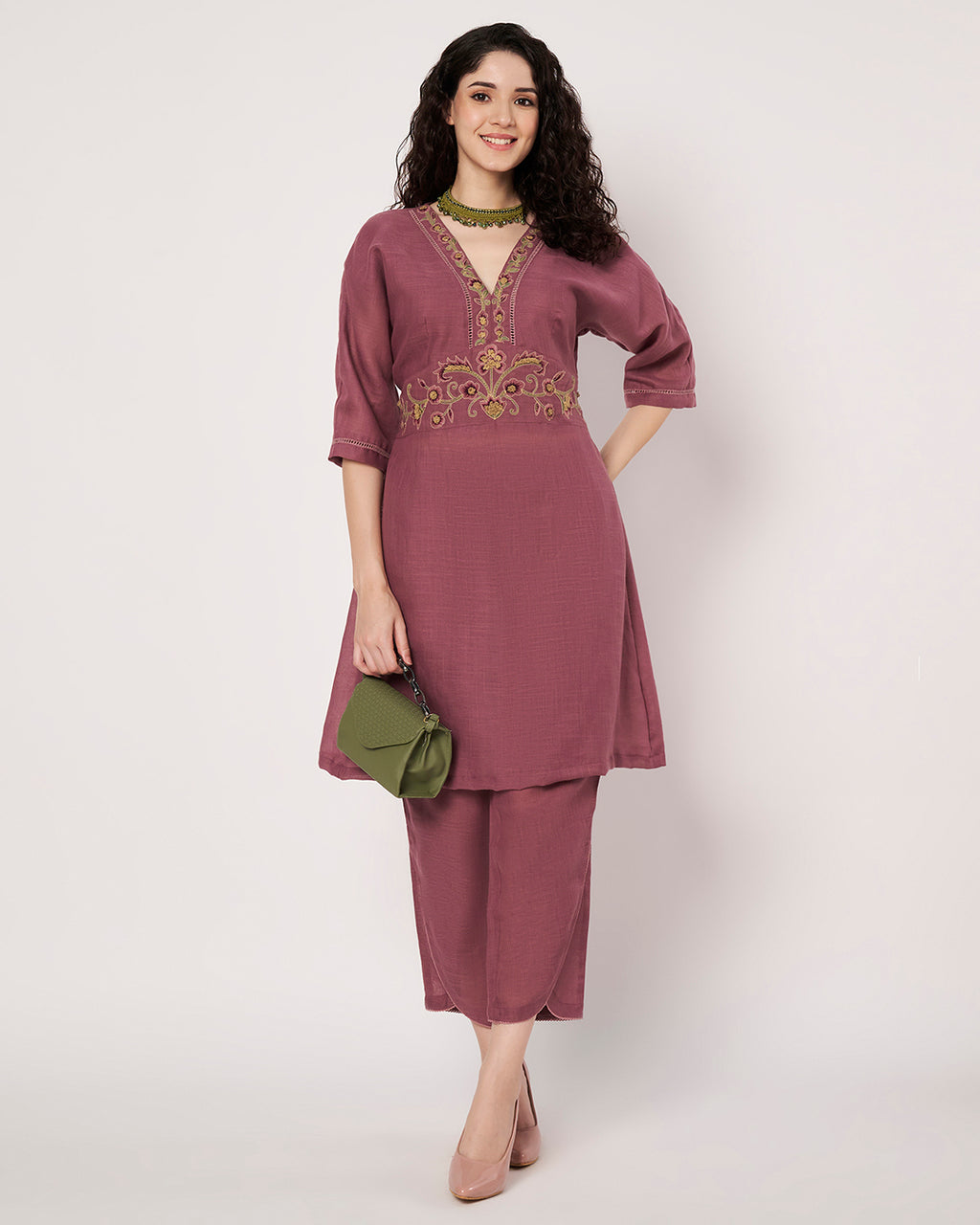A graceful dusty rose kurta set featuring fine embroidery detailing along the neckline and sleeves. Crafted from soft cotton-linen fabric, this ensemble radiates charm and sophistication while ensuring comfort throughout the day.