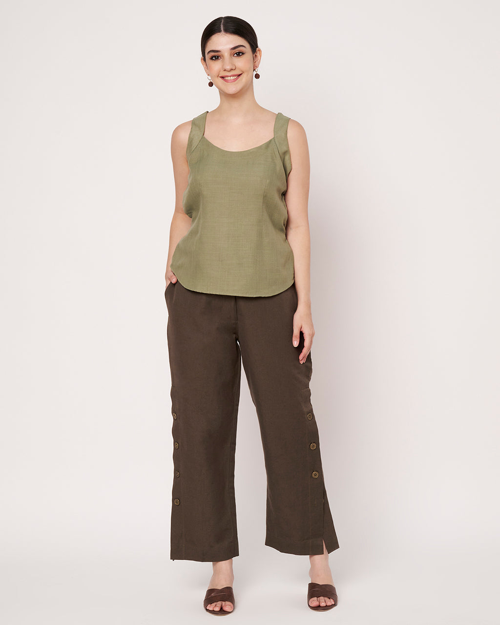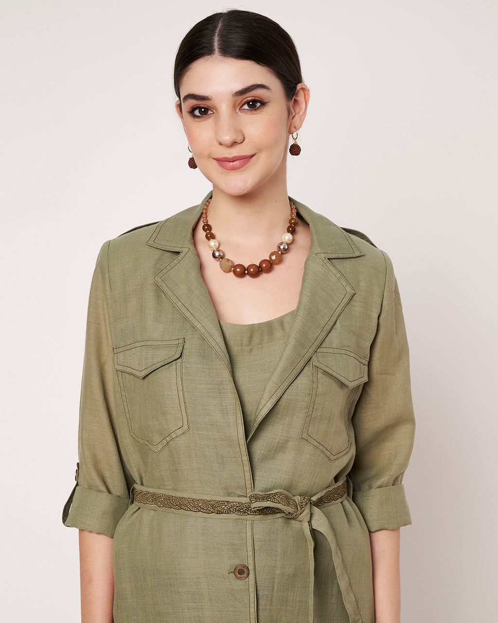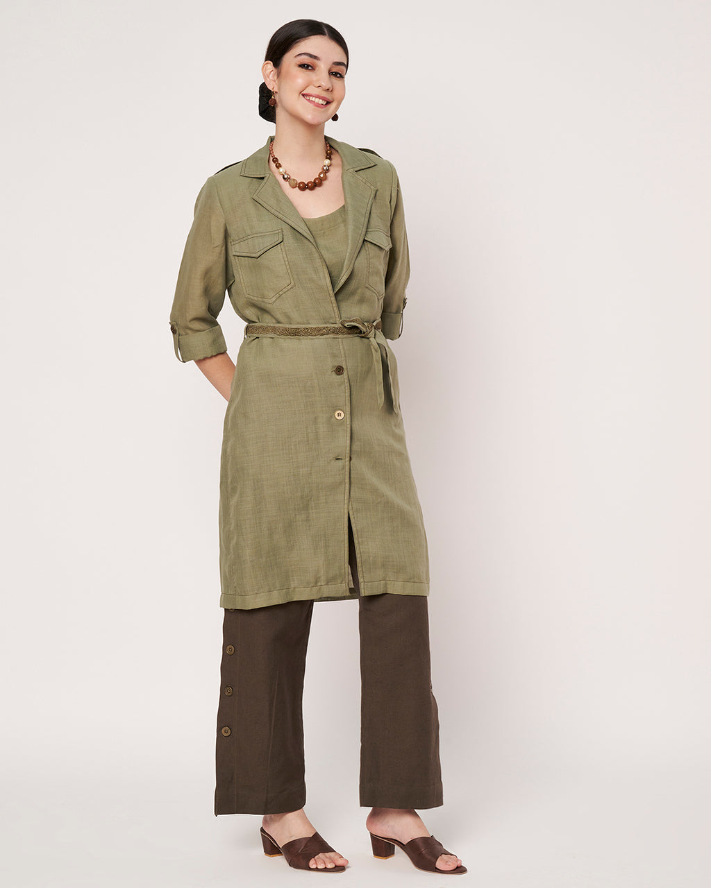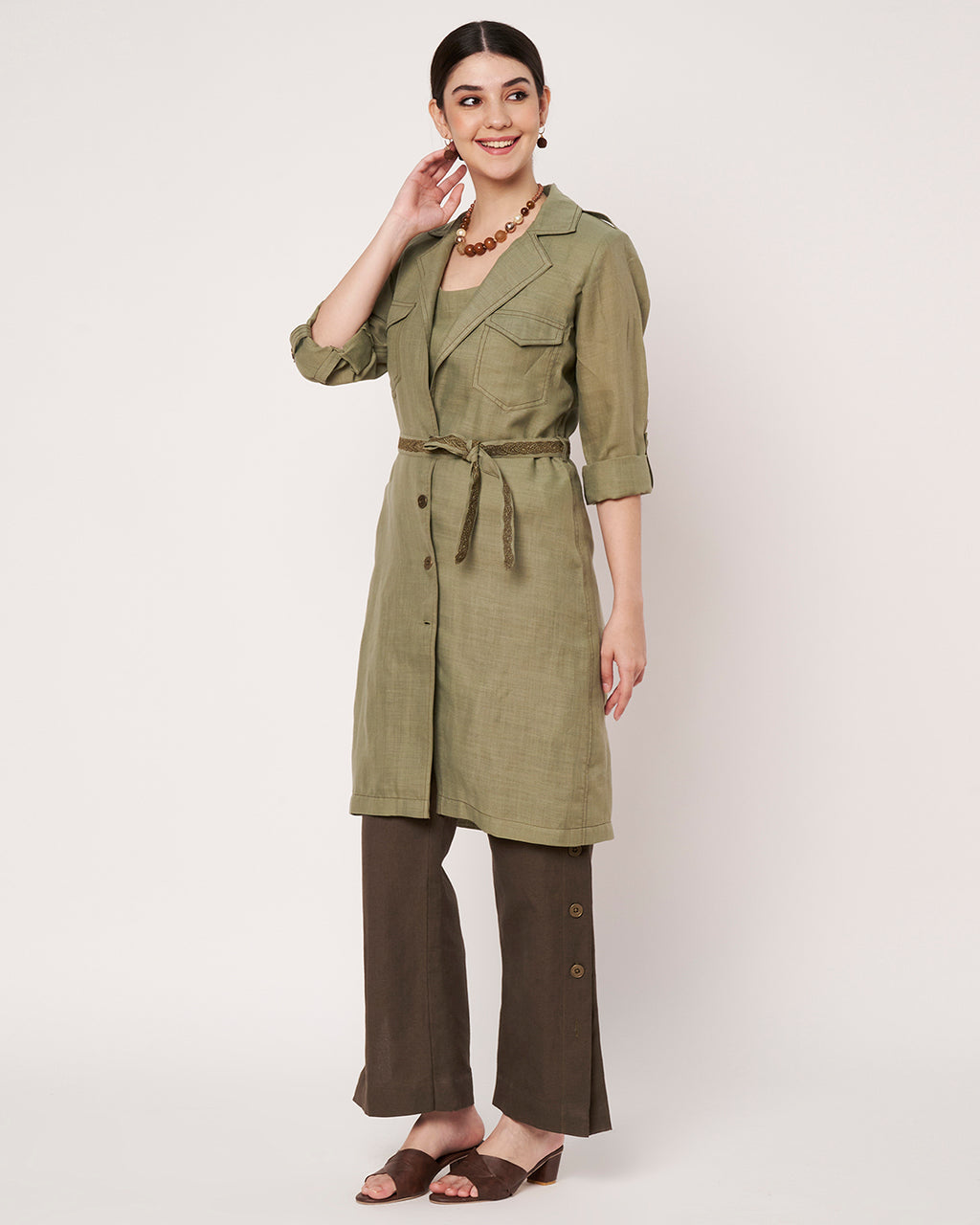 Channel earthy sophistication with this olive belted shirt-style kurta, paired with contrasting brown pants. The belt cinches the waist beautifully, giving a flattering, structured fit.