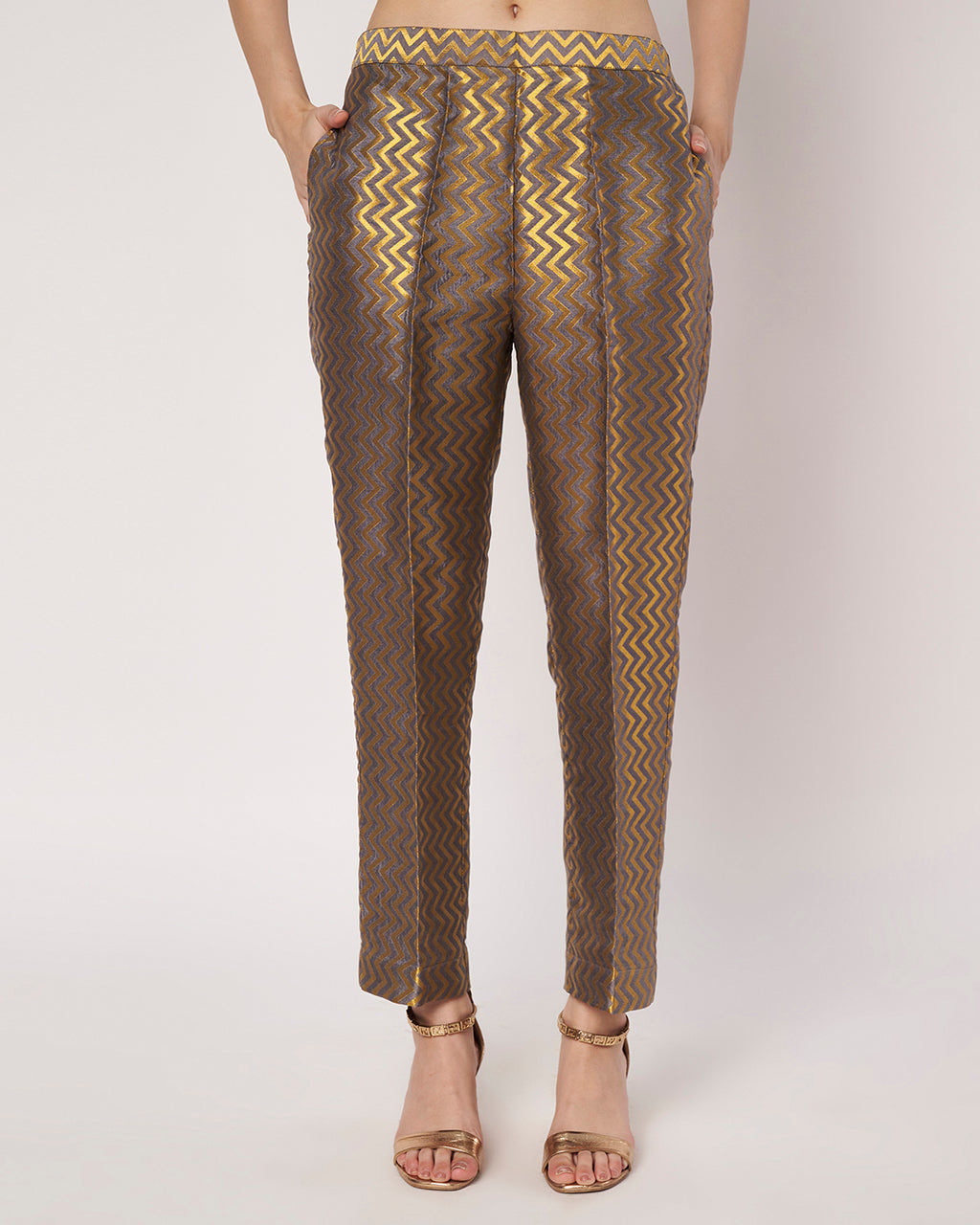 This grey wrap-style embroidered kurta set paired with chevron-printed pants is a contemporary take on tradition. The asymmetric drape adds a touch of modern artistry to the ensemble.