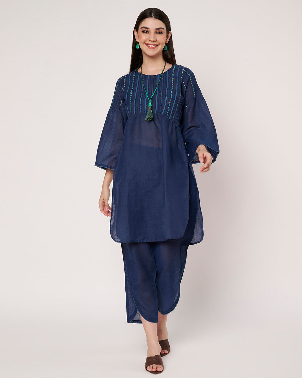 A simple yet classy navy straight-fit cotton linen kurta paired with matching trousers. Designed in breathable fabric with minimal detailing, it’s perfect for everyday wear.