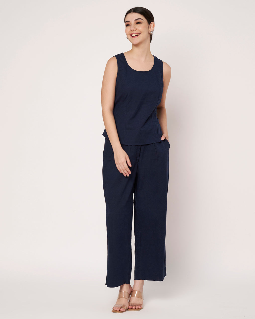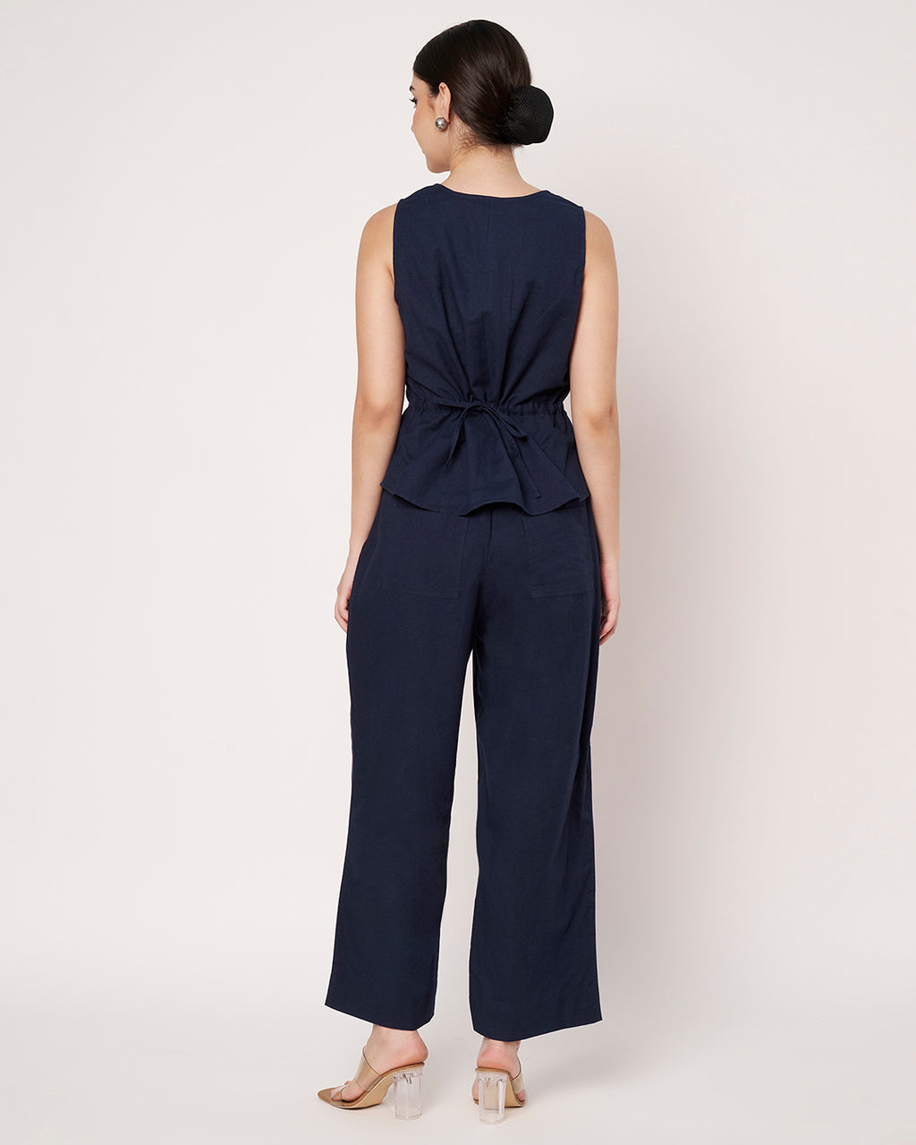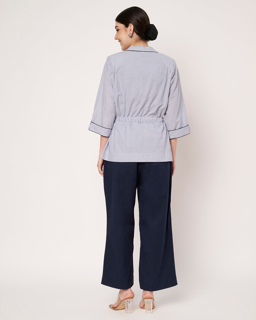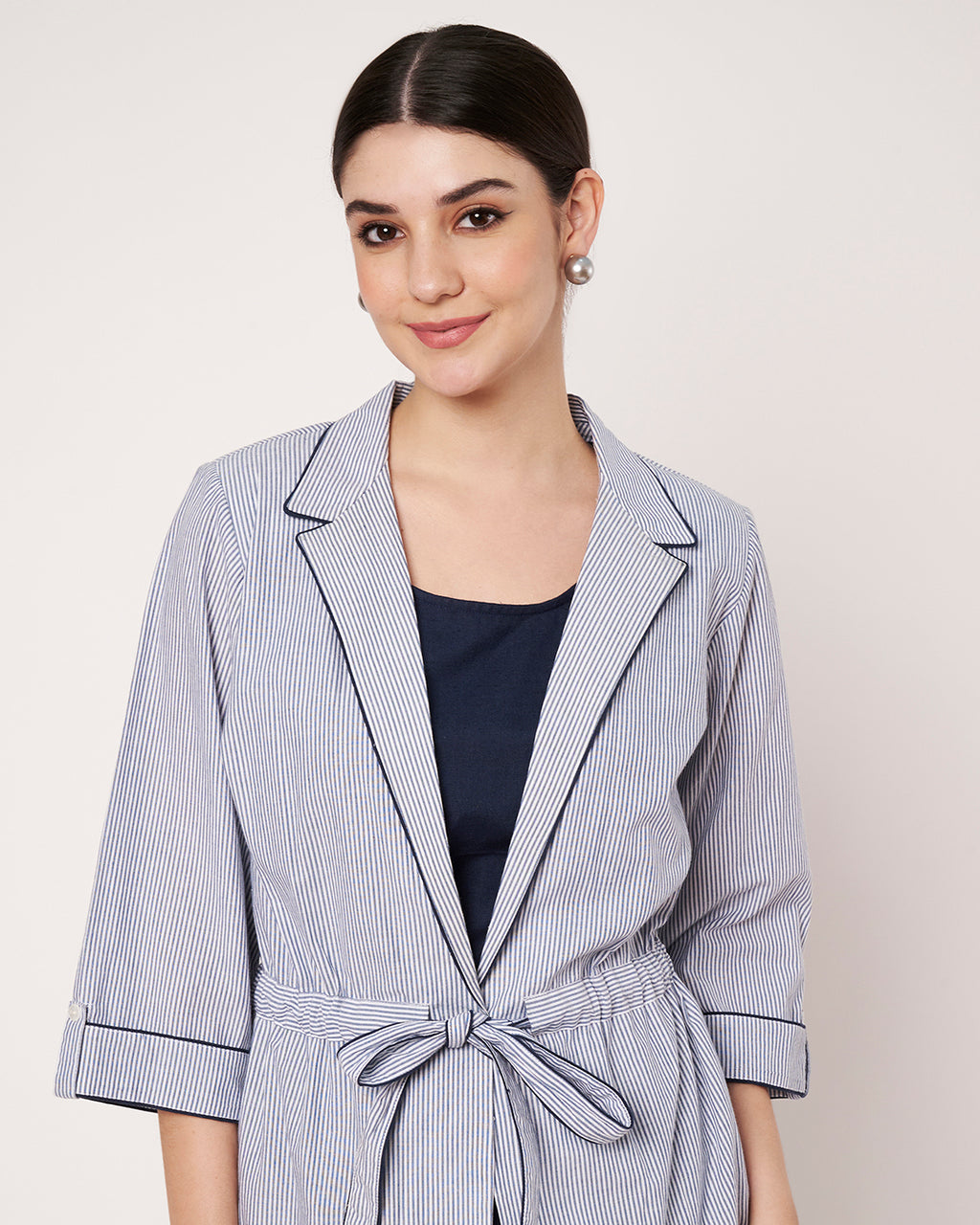 A boho-chic striped overlay jacket layered over a navy blue co-ord set. The relaxed silhouette and tassel detailing give it a breezy, modern vibe.