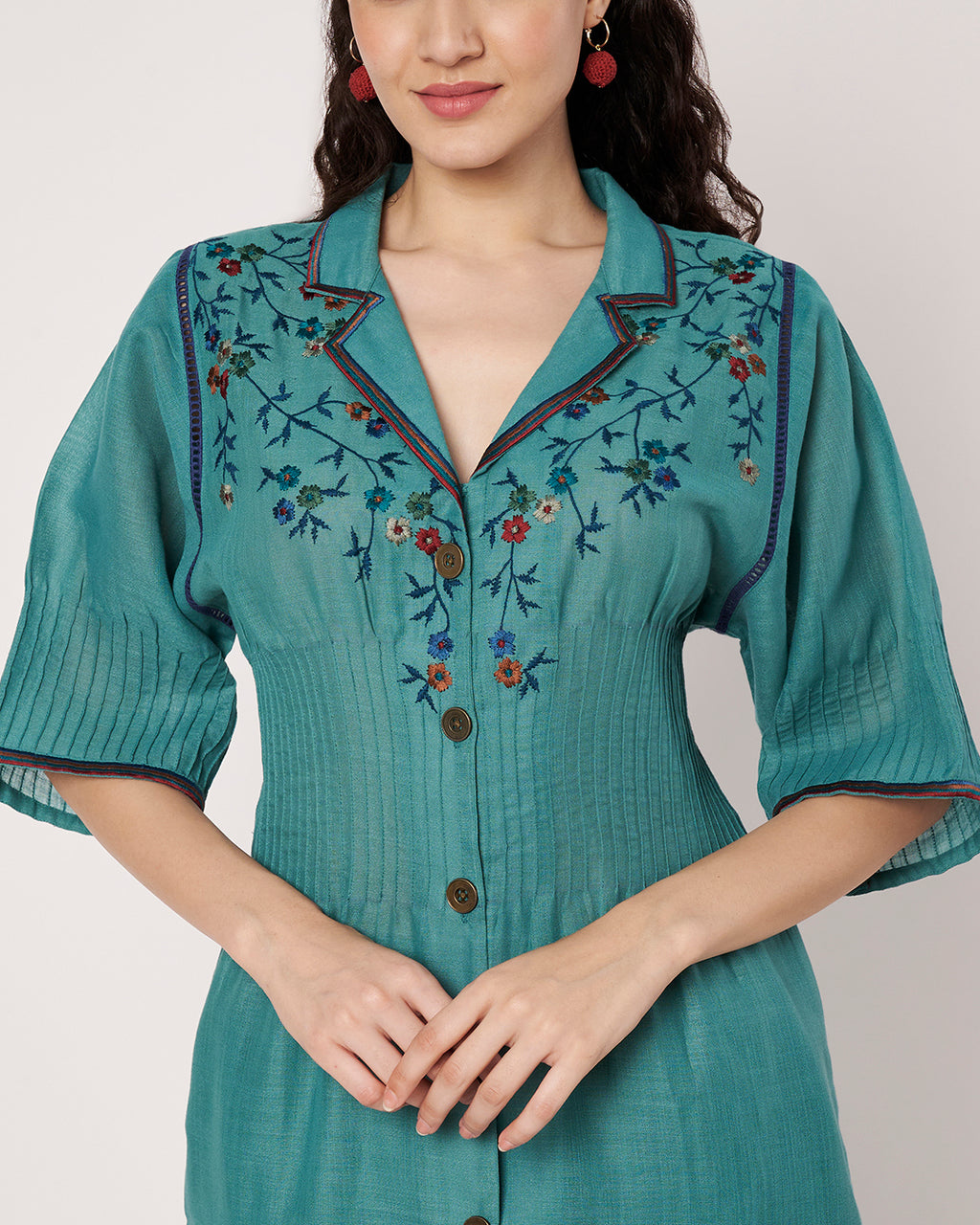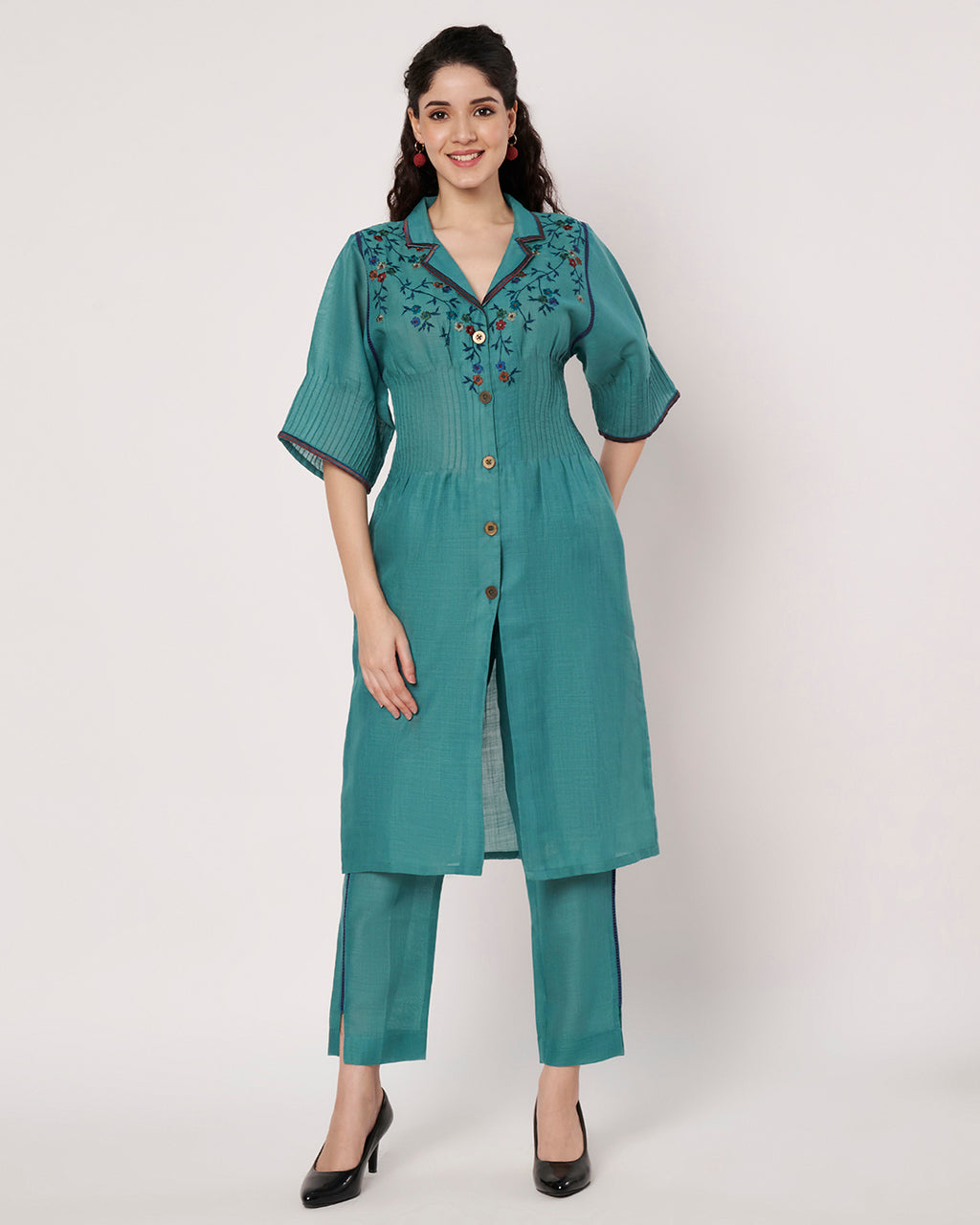 This teal button-down kurta set is adorned with delicate floral embroidery, adding a vibrant charm to its classic silhouette. The design merges modern tailoring with traditional motifs, perfect for semi-formal occasions.