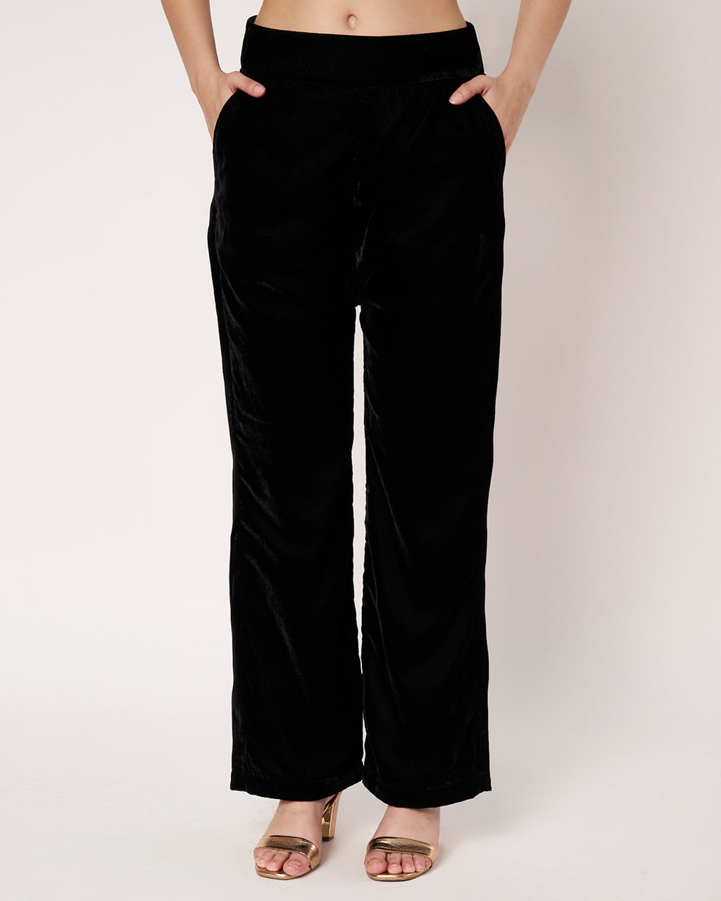 A luxurious black velvet co-ord set featuring intricate golden embroidery on the front and cuffs. The long jacket-style top is paired with straight-fit pants, offering a rich festive appeal.